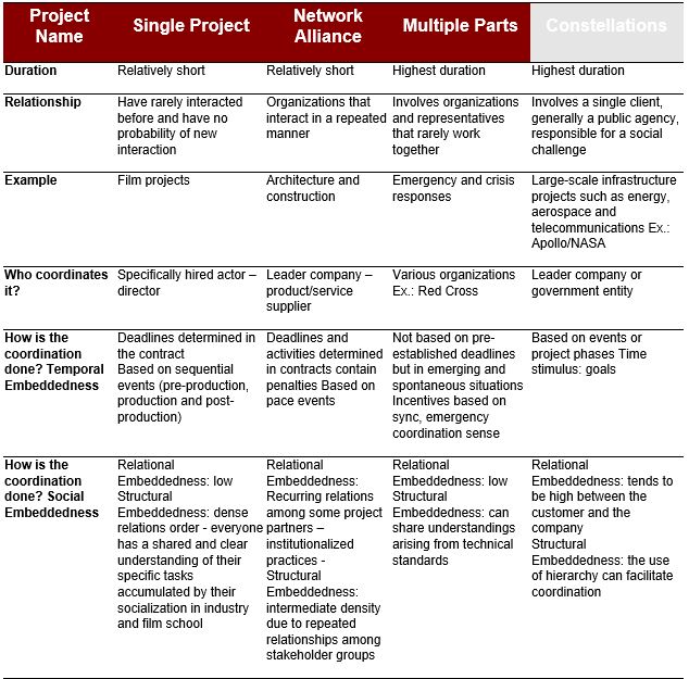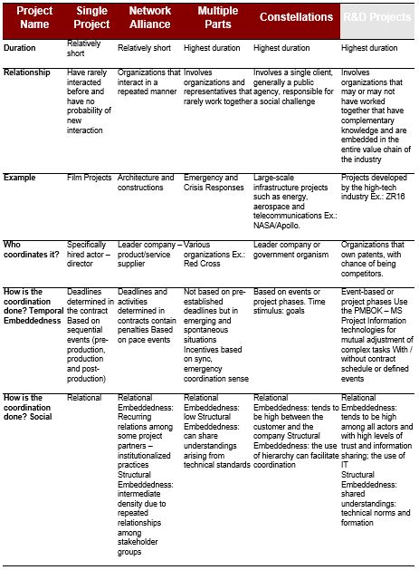 This type of temporal Embeddedness and social Embeddedness provides mechanisms for managing the uncertainty associated with projects and facilitates collaboration among the actors involved. Thus, focusing on the temporal and relational insertion mechanisms, (Jones & Lichtenstein, 2008) have offered a proposal of a typology for inter-organizational projects through empirical examples. The authors offer four different types of projects, two that are relatively short, such as film production and architectural design and construction, and two of longer duration, such as emergency projects or responses to crises and infrastructure projects (table 1). According to empirical evidence, these are the various forms of social and temporal Embeddedness in each type.