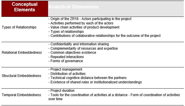 Seeking empirical evidence to meet the objective of deepening the understanding of how the dynamics of a collaborative R&D project occurring in a high-tech and knowledge-intensive industry develop, the empirical object is analyzed from three different dimensions: a) types of relationships: these are the types of relationships surveyed in a collaborative R&D project and the contributions of each actor involved in the process to develop the project at each stage of the production phase; b) social Embeddedness: we seek empirical evidence on knowledge sharing, common goals, shared norms, cognitive distances and governance; this dimension was divided into relational Embeddedness and structural Embeddedness; and c) temporal Embeddedness: temporal Embeddedness constitutes the main forms of the temporal coordination of activities between the actors involved in the collaborative project. These three dimensions of analysis allow a definition of how multiple organizational actors coordinate their activities together and how these actors are involved in relationships and shared understandings. Figure 1 illustrates the theoretical model that guides this research.