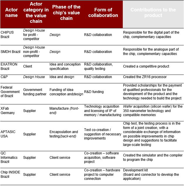It is possible to say that this situation is mainly due to the intensity of knowledge, the required investments and the value added to the product. One respondent stated, "We joined knowledge, we always seek a partner who knows, we need someone to give agility to the process because a single company does not know everything". The various semiconductor chain phases can be developed by several companies located in different regions, thus allowing the unbundling of the segment. During the process of development for the ZR16, nine actors were directly involved collaboratively in the different stages of the manufacturing process. Among them, there were customers, suppliers, competitors and government agencies.
