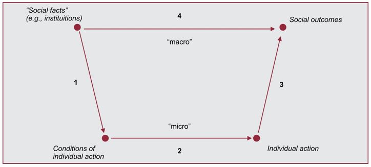 The notion of microfoundations is a fundamentally simple one (Felin & Foss, 2005; Barney & Felin, 2013). Thus, it is the heuristic that collective/aggregate/macro outcomes (e.g., organizational performance) and formations (e.g., institutions) be explained in terms of the actions and interactions of lower level entities, typically (but not necessarily) individuals. In turn, micro entities may be influenced by macro entities. The famous Coleman bathtub, see figure 1, illustrates these notions (Coleman, 1990). The point of the diagram is that explanation in social science takes place by means of the mechanisms implied by Arrow 3, or Arrows 2 and 3, or Arrows 1, 2 and 3, but never Arrow 4 alone (Abell, Felin & Foss, 2008). The latter is at best shorthand for a more complex microfoundational set of mechanisms.