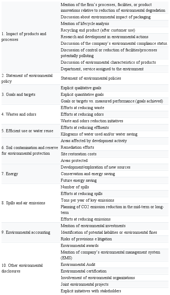 To do so, 40 represents the subcategories of environmental disclosure attributes stablished in the environmental disclosure content. Therefore, if the information is disclosed it is assigned 1, otherwise it is assigned 0. Thus, measuring the extent of environmental disclosure on websites, this approach assumes that every item of environmental disclosure content is equal in importance in the model (Singhania & Gandhi, 2015).