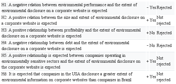In this context, the general objective of the study is to explain the extent of environmental disclosure on corporate websites of companies located in Brazil and the USA through corporate characteristics. As for the specific objectives of the study, they are as follows: identify through an Environmental Disclosure Index (EDI) the extension of environmental disclosure on the investigated companies’ websites; point out whether there is a difference in the extension of environmental disclosure between companies in Brazil and the USA; and to verify which variables explain the environmental disclosure in corporate website.