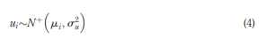 In this case, ui presents normal positive distribution with an average value μiconditional to the characteristics zi, and δ is a vector of coefficients to be estimated. The estimation strategy consists of maximizing the function of log-likelihood conditioned to the vector of coefficients β and δ, and to the parameters and (Battese & Coelli, 1995).