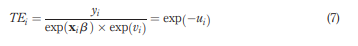 In addition to defining the determinants of production and efficiency, a particularly useful analysis using the SF model is the estimation of technical efficiency. Based on equation (2), the production (or cost) yi can be given by the product of three components: