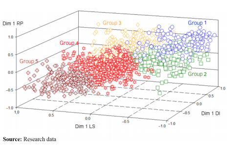 · Group 4 (C4) – Medium-Medium-Low Governance (523 institutions, 44.2%): the most expressive group, concentrating cooperatives that present a low performance in MS and relatively moderate performance in RP and LS. These results are only higher than those of Group 5.