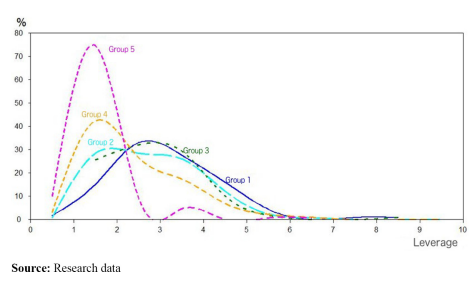 Groups C4 and C5 presented performance levels inferior to the others, with high frequencies of low leverages, above all for the cooperatives in C5. The dispersion in C4 is greater, i.e. although there is an elevated concentration of low leverages, there is, when compared to C5, higher participation of cooperatives with superior leverage. The higher level of leverage of C3 compared to C2 can also be associated with the larger size of the institutions in the group in terms of number of members.