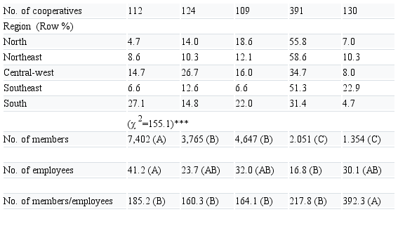 Table 1 presents the percentages and average values of selected socioeconomic indicators. The distribution of the groups across the five Brazilian regions confirms expectations concerning regional differences in the models of Brazilian credit unions. The best results were seen in the Southern region, with the largest share of cooperatives in the groups qualified as having relatively higher levels of governance (64% of cooperatives in Groups 1, 2 and 3). The institutions in the Central-West region presented, on average, better performances than the other regions, with the exception of the Southern region.