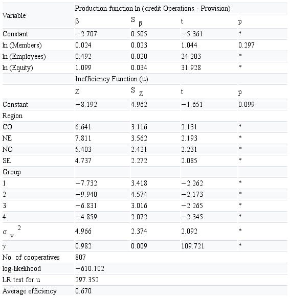 In the next step, we analyzed the financial performance and technical efficiency of cooperatives based on the estimates of a SF model. The dependent variable was the log of the net loans (credit operations − loss provision). The determinants of the production function were: log of the number of members, a proxy for the cooperative size; log of the number of employees, a proxy for labor; a log of changes in the cooperative’s average equity in the period (average equity + lowest average value + 1), thus considering cooperatives with negative equity, which represents a proxy for the cooperative’s capital.
