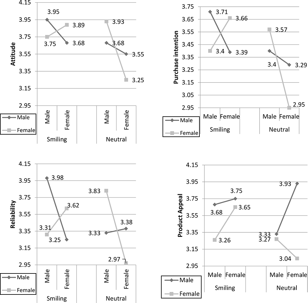 The distribution of the 154 participants in the experiment was 48 per cent in the neutral condition (n = 31 females and n = 43 males) and 52 per cent in the smiling condition (n = 35 females and n = 45 males). There was no difference in the number of participants in each group χ2(1) = 0.054; p = NS. All dimensions achieved high levels of reliability: attitude toward the product, α = 0.81, reliability, α = 0.82, product appeal, α = 0.86 and purchase intention, α = 0.85.