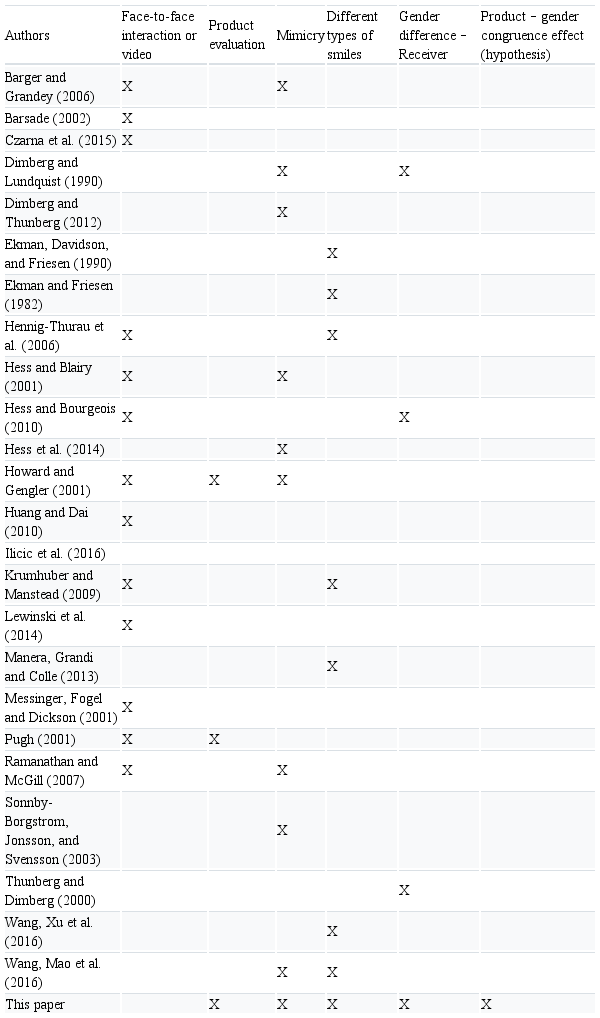 Emotional contagion theory explains how the manifestation of one person’s emotion can provoke a similar emotion and behavior in other individuals (Hess, Houde, & Fischer, 2014). According to the theory, emotional contagion occurs in two steps. First, the perception of the emitter’s expressive conduct causes the receiver to replicate the behavior covertly by motor mimicry (Trougakos, Jackson, & Beal, 2011). Second, this replication automatically affects and elucidates the receiver’s emotional state (Hatfield et al., 1994). Research on emotional contagion uses face-to-face interactions (Barger & Grandey, 2006) or videos (Dallimore et al., 2007; Lewinski et al., 2014). Studies using static facial expressions are common in psychology, but they do not investigate the effects of ads in marketing or consumer behavior fields. Table I summarizes the empirical studies on emotional contagion and smiles.