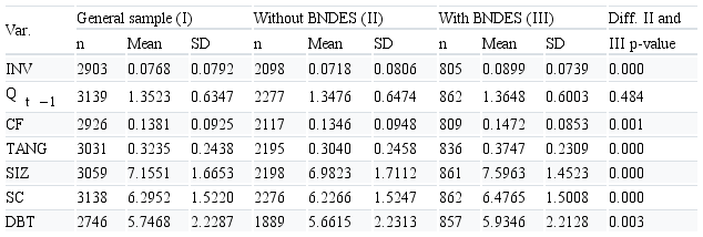 To assess the behavior of the variable of investment (INV), relative to BNDES loans, variables related to the contracting of BNDES loans are included in the model. The dummy variable BNDES takes the value 1 for the years in which the companies contracted loans from the BNDES and 0 for the years in which no loans were contracted.