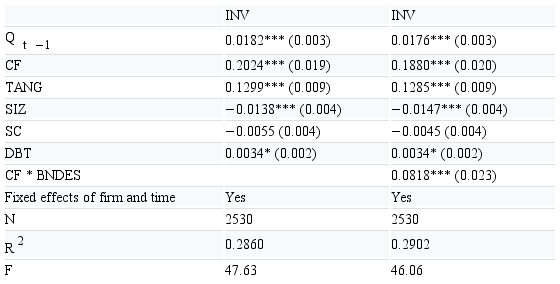 INVi,t=β0+β1Qi,t-1+β2CFi,t +β3TANGi,t+β4CF*BNDESi,t+ δXi,t+∑ifirm+∑tyear+ui,t