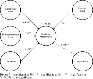 The study resulted in a robust model, with a high explanatory factor for the latent variable relational attractiveness and commitment was the most influential factor, followed by expected value and interorganizational trust.