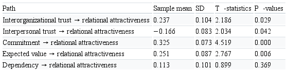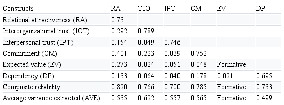 Subsequently, the reflexive measurement models were evaluated. Reflective model indicators (relational attractiveness, interpersonal trust, interorganizational trust, commitment and dependence) were assessed by the criteria for evaluating reflexive measurement models, which, according to Hair et al. (2017), are, namely, internal consistency, indicator reliability, convergent validity and discriminant validity.
