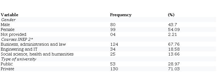 We received 284 questionnaires, which we reviewed for incomplete questionnaires and/or skewed responses (Freire, Senise, dos Reis, & Ono, 2017). We completed the sample with 183 respondents, 33 different courses, 22 different public and private HEIs from six states of the Federation (São Paulo, Minas Gerais, Goiás, Mato Grosso do Sul and Rio Grande do Norte). Demographic details are shown in Table 1.