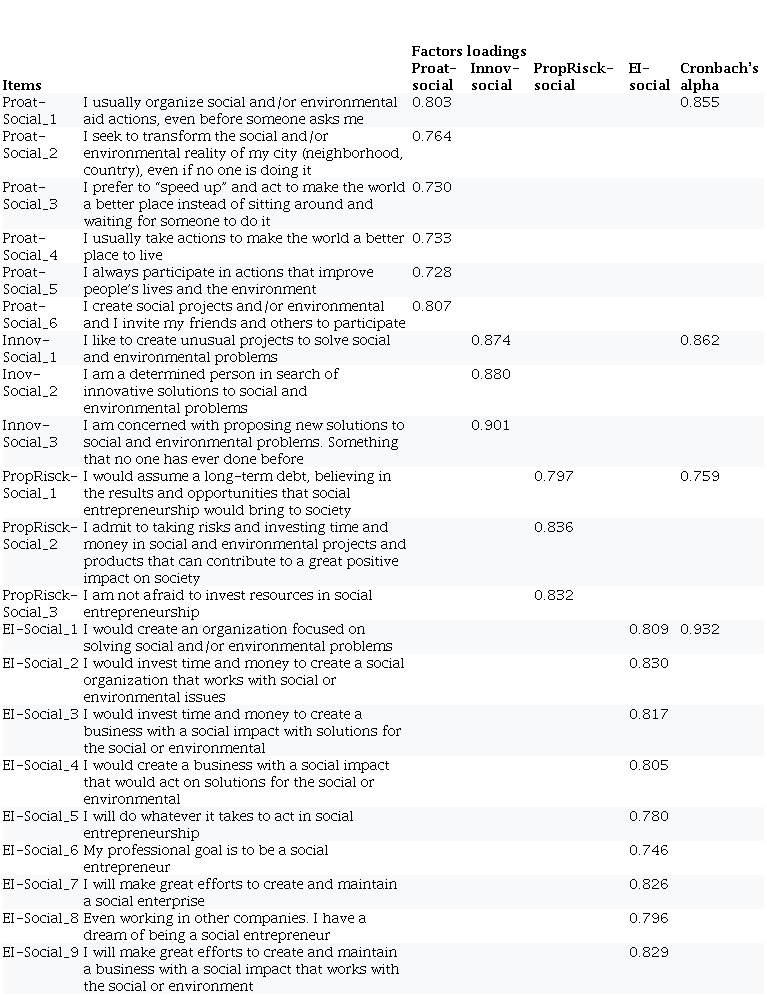 EI for the social: intention to undertake is a construct widely tested and validated in the literature. Thus, we measured it based on items adapted from the instruments proposed by Liñán and Chen (2009) and by Moraes, Iizuka, and Pedro (2018).