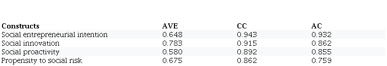 This study confirmed convergent and discriminant validities, with all values adequate with AVE (> 0.50), compound reliability (> 0.70) and Cronbach’s alpha (> 0.60), as displayed in Table 3, and the quality criteria psychometric variables of the attended variables, according to Table 4.