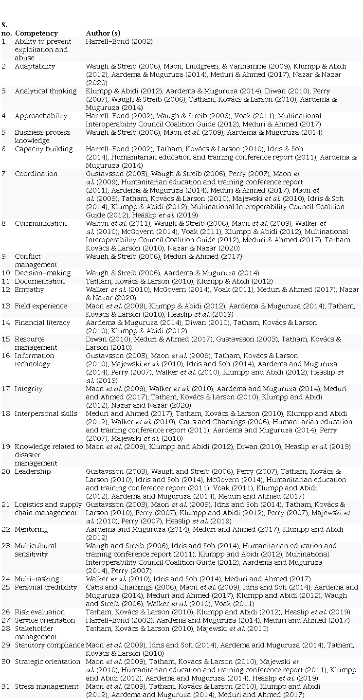 A good amount of research was carried out to identify the competencies required by logistics and supply chain professionals of business organizations (Gowen & Tallon, 2003; Knight, Harland, Walker, & Sutton, 2005; Mangan & Christopher, 2005; Thai, Cahoon, & Tran, 2011; Van Hoek, Chatham, & Wilding, 2002; Sohal, 2013). However, evidence of competency models in the humanitarian context is minimal. Humanitarian researchers strongly recommended the need for identifying and developing detailed competency models and define the standards of skill requirements of the emergency relief personnel (McCall & Salama, 1999; Chang, 2005; Mashni, Reed, Sasmitawidjaja, Sundhagul, & Wright, 2005; Alexander, 2003; Forsman, 2002; Heaslip et al., 2019; Khan, Lee, & Bae, 2019; Besiou & Van Wassenhove, 2020), which can, in turn, develop the sustainability of HL (Khan, Sarmad, Ullah, & Bae, 2020).