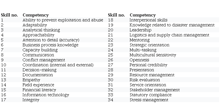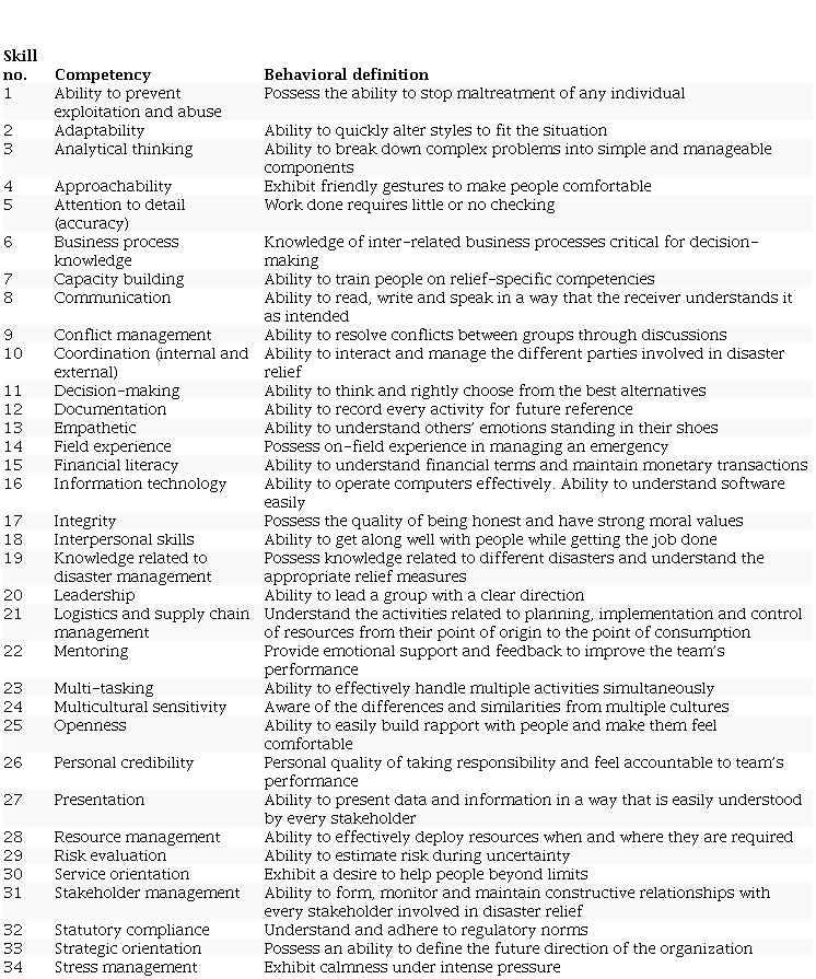 This analysis reveals that the more innate and yet trainable competencies, such as leadership, interpersonal skills, communication and personal credibility, are the most sought-after competencies by relief organizations. Though earlier research focused more on skill models, which highlighted technical skills, the analysis of the current article showed that personal attributes define the “rightness” of the candidate more suitable for the responsibilities of a relief worker.