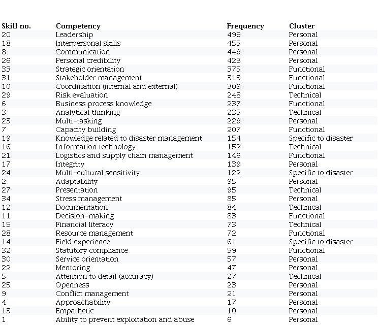 For the purpose of the study, the competencies were divided into four clusters or categories, namely, personal competencies, technical competencies, functional competencies and competencies specific to disaster management. Of the 34 competencies, 16 were identified as personal competencies, 6 as technical competencies, 9 as functional competencies and 3 as competencies specific to disaster management.
