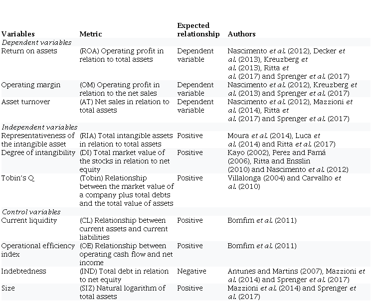Among studies on Brazilian companies, Nascimento et al. (2012) investigated companies in the information technology and telecommunications sectors of BM&FBovespa, considering the relationship between the following variables: DI and the performance indicators AT, NM, ROA and ROE. However, the study showed no relationship between the variables of the defined sectors. Decker et al. (2013) analyzed the relationship between DI and the performance indicators ROA and ROE in Brazilian companies listed in the Bovespa index and concluded that there is a positive relationship between intangibility and performance, considering the variables studied. Additionally, Kreuzberg et al. (2013) assessed the relationship between intangibility and performance of companies listed on BM&FBovespa by investigating DI and the economic indicators NM, ROA and ROE. However, their results showed no significance for the relationship portrayed.