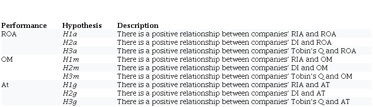 Because of the results and analyzes carried out in this study, only the hypotheses predicting a relationship between RIA and the proposed performance variables (ROA – H1a, OM – H1m and AT – H1g) were rejected, as none of the results found significant and positive relationship for those variables. These results can partly be explained by the difficulties in accounting for intangible assets, which may skew some data.