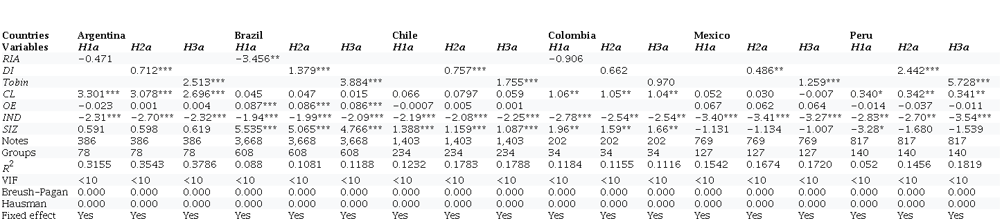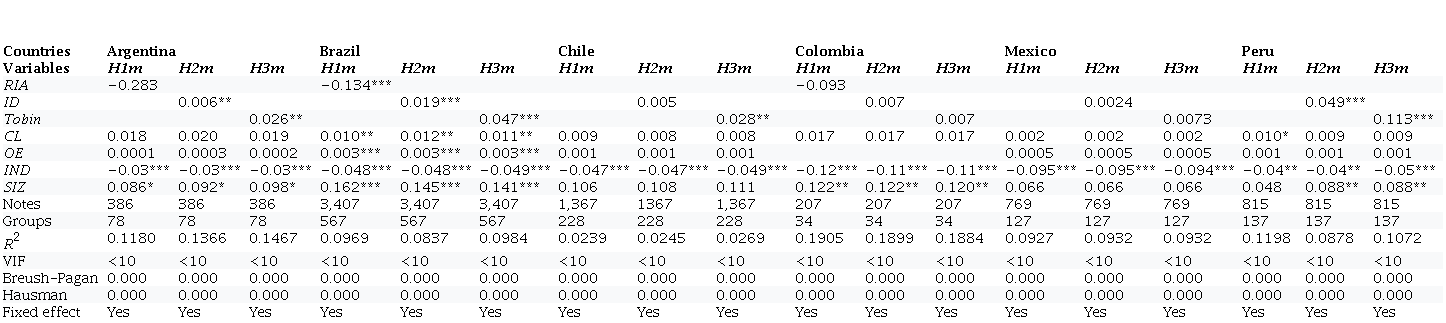Regarding DI and Tobin’s Q, results were positive and significant for companies in Argentina, Brazil, Chile, Mexico and Peru. In these countries, results revealed that the greater the intangibility measured by its market value, the greater the profitability over companies’ total assets.