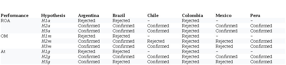 As for the relationship between AT and SIZ, the result is in line with Sprenger et al. (2017), who found a significant association between performance and size in the countries belonging to GLENIF. Argentina (1%), Chile (1%), Colombia (5%), Mexico (1%) and Peru (5%) showed significance in the relationship between AT and SIZ, however, negative.