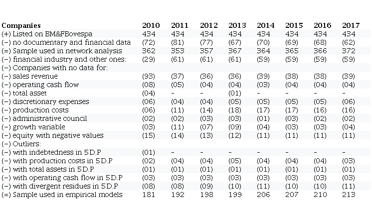 The period of analysis comprised eight years (2010 to 2017), initially justified by the year of full IFRS adoption by the Brazilian accounting system. The research population refers to Brazilian publicly traded companies listed on the BM&FBovespa (Brazilian Stock Exchange) in December 2017, to segregate retrospectively those listed in each year, taking into account data for the network analysis of board members. Table 1 shows the sample composition.