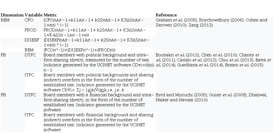 Table 2 shows the research construct. We calculated the dependent variable (REM) based on four metrics, as suggested and used by Roychowdhury (2006), Zang (2011) and Cohen and Zarowin (2010), in which: Sit = revenue from sales of year t; Ait - 1 = Total assets at the end of the year t−1; ΔSit = change in sales revenue in year t to the year t − 1; ΔSit - 1 = change in sales revenue in year t−1 compared to year t-2; CFOit = Operating cash flow at the end of period t; PRODit = Cost of Goods Soldt + ΔInventoryt; DISEXPit= Discretionary expenditure at the end of the year t.
