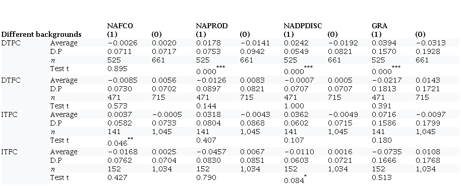 In BI with FB, the findings indicate a statistically significant difference between the average of abnormal discretionary expenses of companies with an indirect link to BI with FB (−0.0110) and companies without such link (0.0016). In general, this result indicates that companies with a BI FB are less prone to EM practices through real activities.