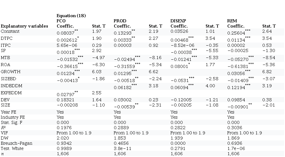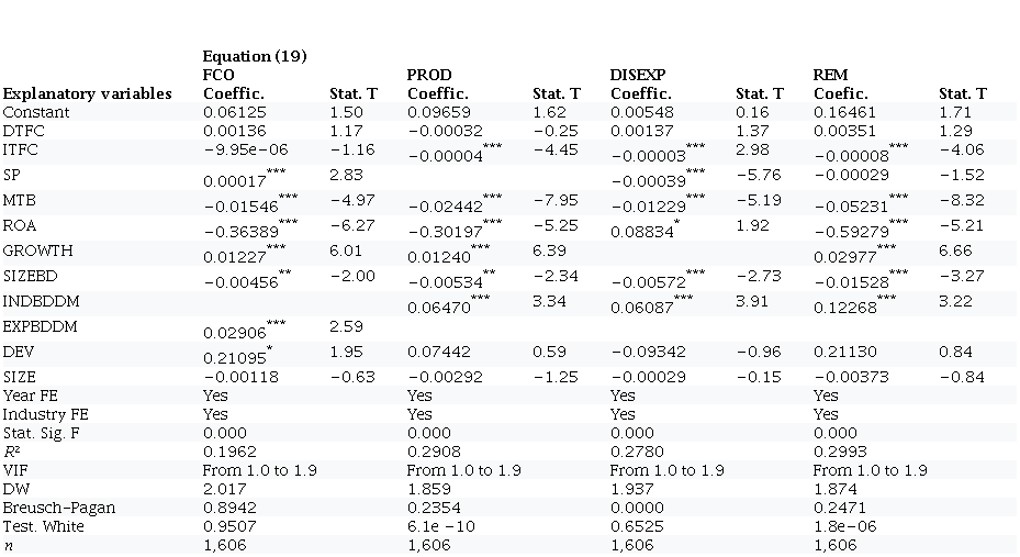 Equation (1) shows the specification of multiple linear regression (OLS) models, with industry (IND) and year (YEAR) fixed effects, with robust errors to correct possible heteroscedasticity problems. We ran the following equations according to each REM, i.e. the FCO, PROD, DISEXP and REM models.