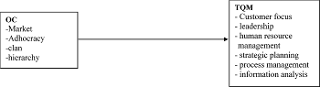 This paper used a quantitative approach to estimate the relationship between OC (market, adhocracy, clan and hierarchy) and TQM (customer focus, leadership, human resource management, strategic planning, process management and information analysis), as Figure 1 shows: