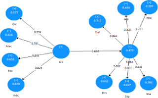 After confirming the validity and reliability of the MM, our study followed by analysing the hypothesized association via the PLS algorithms and bootstrapping in Smart PLS 3.2.7 (the results of this analysis can be seen in Figure 2 and Table 3). As suggested by Hair et al. (2014), the average for the estimation of the SM is the R2, as the objective of the prediction-oriented PLS-SEM method is to illustrate the dependent latent variables’ discrepancy, thus R2 as one of the essential purpose variables has to be substantial. In line with Hair et al. (2017); Hilman et al. (2019), in management research, the R2 value can be thus categorised: 0.75, 0.50, 0.25 as substantial, moderate and weak, respectively. Based on this research, after PLS algorithm analysis R2 was revealed to be 0.473, signifying that OC accounted for 47.3% of the variance in TQM, which is between weak and moderate.