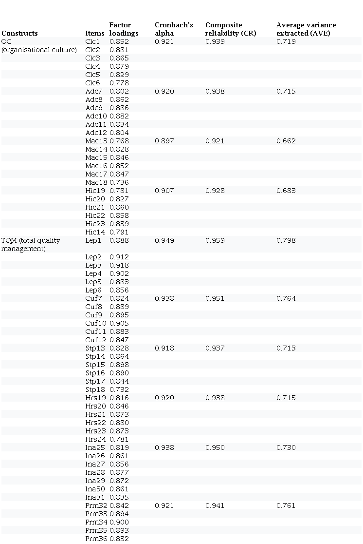 In this paper, the OC instrument was adapted from Cameron and Quinn (2006). It contains 24 items in a one-dimensional array, and numerous scholars have confirmed the apparatus alias instrument and have established its reliability and validity (Hilman et al., 2019; Ali et al., 2019; Haffar et al., 2017; Hilman et al., 2019; Ali et al., 2019). The paper used a seven-point Likert-type scale starting from “strongly disagree (=1)” up to “strongly agree (=7)” to measure the instruments. The TQM actions come about by measurement using the six criteria of the MBNQA, which have earlier been widely used in numerous findings for TQM application of measuring (Hilman et al., 2019; Ail et al., 2019; Haffar et al., 2017; Ali et al., 2019; Lam, Lee, Ooi, & Lin, 2011; Prajogo & Hong, 2008). The study adapted measurement 36 items for TQM as a single entity from the research works done by Samson & Terziovski, 1999; Wang et al., 2012; Prajogo & Sohal, 2006. These items have a good theoretical foundation and a strong indication of construct reliability and validity (Ail et al., 2019; Haffar et al., 2017: Ng, Zhao, Fan, & Rungtusanatham, 2014). To estimate the suggested model, the partial least square-structural equation model (PLS-SEM) was used to create the measurements’ validity and reliability and examine the assumed hypothesis as described in the subsequent segments.