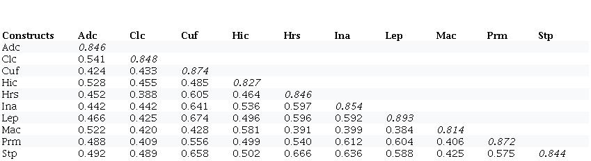 Discriminant validity is evaluated by calculating the square root of the AVE as recommended by Hair et al. (2014) and Fornell and Larcker (1981). Based on the latter, the square root of the AVE is personified on the diagonal line in the construct correlation matrix and should be greater than the off-diagonal elements in the corresponding rows and columns (Ali et al., 2019). In the results shown in Table 2, all the square roots of the AVE characters surpassed within its own rows and columns, suggesting the discriminant validity can be thus confirmed in the current study.