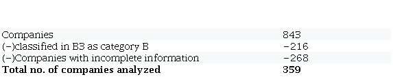 The companies observed totaled 843. However, 216 classified in B3 as category B were excluded because there was no obligation to publish information for item 13.4 of the Reference Form. Regarding accounting information, 268 were excluded for not having information for the variables object of this study. Thus, we ended up with 359 companies and 1,990 observations, as shown in Table 1.