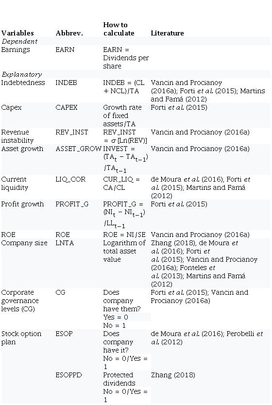 Companies with revenue irregularities are likely to be less committed to paying dividends (Vancin & Procianoy, 2016a, 2016b); to capture this effect, we used the variable revenue instability. When increasing assets, companies need resources. Therefore, the resources used for asset growth compete with dividends payout (Vancin & Procianoy, 2016a, 2016b). Current liquidity seeks to control the effect of companies that offer more security so that their managers can maintain or increase dividend payout levels (de Moura, Padilha, & Silva, 2016; Forti et al., 2015; Vancin & Procianoy, 2016a; Martins & Famá, 2012).