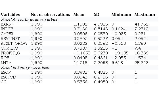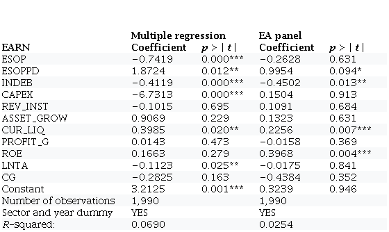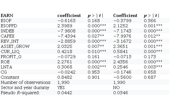 EARNi,t=βi+β1ESOPi,t+β2ESOPPDi,t+βnVCDn,i,t+ εi,t