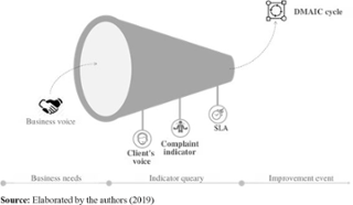 The business voice represented by the interview with managers characterizes a business need (Hammer, 2015), that is, the demands of the manager responsible for the process. The voice of the customer (Asad, Mohajerani & Nourseresh, 2016; Karpen, Bove, Lukas & Zyphur, 2015; Kreuzer et al., 2020; Moormann & Palvölgyi, 2013), the complaint index and SLA – indicators monitored by the quality area – are indices that indicate with a greater degree of assertiveness which of the initially proposed demands should be prioritized to, finally, carry out improvements through the application of the DMAIC method (define, measure, analyze, improve and control).