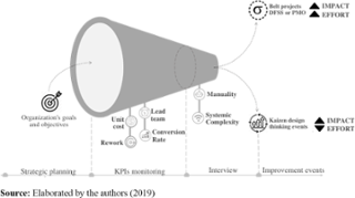 Furthermore, it is necessary to identify the best tool to promote continuous improvement. For processes whose focus is on process simplification, without systemic implementations, with low effort and from low to high benefit, short-term improvement projects, about a week, are recommended, such as Kaizen and Design Thinking events, which enables process improvement, with quick implementations to enhance the customer experience. On the other hand, when the results require greater effort and dedication to investigate further the root cause of a problem, green and black belt projects are indicated in which there is immersion in Six Sigma for structuring, analyzing and improving processes.