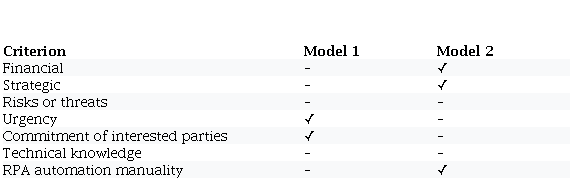 Regarding the objective of comparing these criteria identified in the prioritization of processes to those in the literature, we found that the criteria of strategic alignment, financial resources, urgency and stakeholder commitment are factors present in eligibility, whether in the approval of a project or choosing a process for improvement. However, in both models presented, risks, threats or technical knowledge, criteria present in the prioritization of longer term and highly complex projects, were not decisive factors for choosing a process. In contrast, the eligibility of a process for automation via RPA was identified as a specific criterion for improving a process given the high return and low effort compared to large systemic developments, being conducive to short- to medium-term improvements.