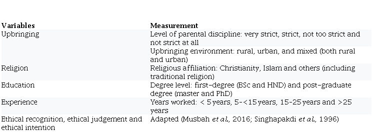 The instrument was designed also to gather data on the respondents’ demographics. The upbringing was measured by the level of parental discipline based on Kohlberg’s CMD theory, which centred on the physical consequences of an unethical action and the avoidance of punishment (Kohlberg, 1973). The operationalisation and measurements of other variables are contained in Table 1. A pilot study was conducted on 20 chartered accountants to pre-test the questionnaire, and feedback was used to revise the instrument before distribution. All the variables were measured with single-item scales, and so, Cronbach α computation was not required (Musbah et al., 2016).