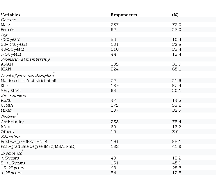 A survey design was adopted to achieve our objectives. We used a structured questionnaire to obtain data from professional accountants of the Association of National Accountants of Nigeria (ANAN) and the Institute of Chartered Accountants of Nigeria (ICAN). The available records of ANAN and ICAN memberships showed that the Institutes have about 20,049 [1] and 41,774 [2] members, respectively, totalling 61,823. We used Yamane’s (1967) formula [3] to determine the sample size of 397 professional accountants drawn from private and public organisations. The sample (ICAN: 268 and ANAN: 129) was drawn proportionately based on each accounting body’s population. The questionnaire was administered with the support of research assistants and contact persons to the respondents in their offices. Of the 397 copies of the questionnaire administered, 352 (ICAN: 237 and ANAN: 115) were returned, of which 329 (ICAN: 224 and ANAN: 105) were found useable for analysis. To address the issue of social desirability bias, the questionnaire was accompanied by a cover letter that had the official address and logo of our institution. The respondents were duly informed in the letter that the study was an academic exercise and were assured of their confidentiality.
