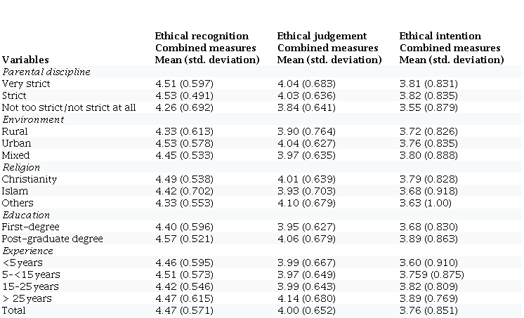 Table 5 also shows that ethical judgement differs significantly based on religion (in V3) and education (in V1). However, no significant difference is seen based on parental discipline, environment and experience in each vignette. The combined measures show that none of the sociodemographic variables caused ethical judgement to differ among the respondents, which suggests that parental discipline, environment, religion, education and experience may not predict accountants’ ability to determine the most ethical option among alternate potentials.