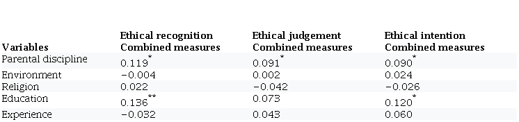 The results of this analysis, displayed in Table 4, show that parental discipline positively correlated with ethical recognition (r = 0.119, α < 0.05), ethical judgement (r = 0.091, α < 0.05) and ethical intention (r = 0.090, α < 0.05). On the other hand, education positively correlated with only ethical recognition (r = 0.136, α < 0.01) and ethical intention (r = 0.120, α < 0.05). There is no significant correlation between the other sociodemographic variables (environment, religion and experience) and EDM stages.