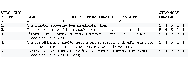 As in prior ethics studies, ethical recognition and ethical judgement were measured by asking the respondents to indicate on a five-point Likert scale [from “strongly-agree” (5) to “strongly-disagree” (1)] whether the situation in each vignette involved an ethical problem and whether they agreed with the decision maker’s decision in each vignette. The ethical intention was measured by asking the respondents whether they would make the same decision if they were the decision maker in each vignette (reverse-coded) (Singhapakdi, Rao & Vitell, 1996). A mean score of three and above indicated high ethical sensitivity, ethical judgement and firm intention towards EDM.