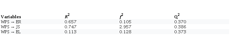 For the path coefficients and hypothesis testing, this study used structural model analysis through PLS-SEM using the bootstrapping and blindfolding techniques, respectively. To test the predictive relevance, the estimated predictive relevance Q2 was calculated through the blindfolding technique following Geisser (1975) and Stone (1974). The results for Q2 indicate a more significant predictive relevance between WPS and ER at 0.370; they also show more considerable predictive relevance between WPS and JS at 0.386 and between WPS → EL at 0.373 (Table 6). Similarly, the results for the coefficient of determination, R2, showed that WPS explained 65.7% of the variance of ER, 74.7% of the variance of JS and 11.3% of the variance of EL. Further, WPS had an effect size (ƒ2) of 0.105 on ER, 2.957 on JS and 0.128 on EL, indicating substantial effects of WPS on the latent variables.