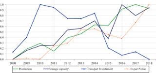 Results of the second part of this study begin with structuring the problem using a BOT graph. In agreement with the problems in the logistics infrastructure driver, four variables were identified. The behavior of both production and export value variables has been growing over the past 10 years, but transport investments are declining counterintuitively while the storage capacity deficit is growing (Figure 2).