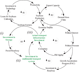 B1 (political loop): This loop shows how Brazilian politics interferes with the logistics system. Soybean production is responsible for generating jobs and foreign exchange for the country. The increase in production means a more significant economic surplus, which attracts more political interest in this sector. In Brazil, there is a high-level economic dependence on the agricultural sector, and therefore, higher political pressure is involved in economic activities related to this system. When such political pressure increases, the government interferes in bidding public works to the private sector for concession agreements. This tactic generates corruption scandals, which negatively impact transport infrastructure investment. A result of ineffective transport investment is a reduction in economic surplus in the Brazilian soybean system. Technically, this is a balancing feedback loop.
